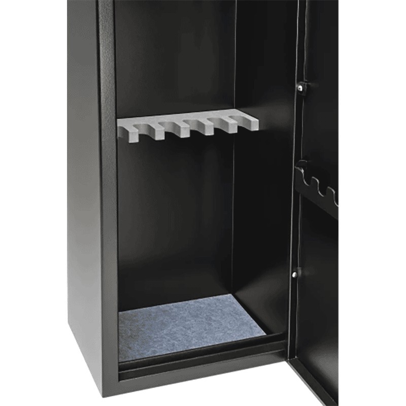 L'aménagement intérieur est pensé pour optimiser le rangement tout en protégeant les armes des chocs directs. Elle permet de stocker jusqu'à 6 fusils de manière ordonnée grâce à un support d'armes adapté. Un atout majeur de ce modèle est l'intégration d'un coffret intérieur sécurisé situé en partie haute, permettant de séparer les munitions ou les objets de valeur du reste du compartiment. La hauteur utile sous ce coffret est de 1250 mm, ce qui convient à la majorité des armes d'épaule standards. Pour une sécurité totale et une stabilité parfaite, l'armoire dispose de trous de fixation pré-percés au sol et au mur, permettant un ancrage solide dans l'habitation.