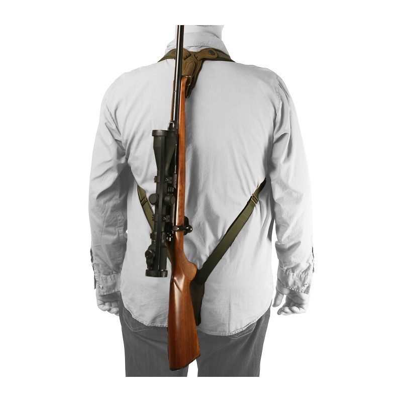 Bretelle réglable double en cordura naturelle pour porter l'arme comme un sac à dos pour avoir plus de liberté du mouvement, entièrement bordée avec un liseré vert, partie postérieure en gomme antidérapante pour avoir une parfaite adhérence à l'épaule, attaches réglables en cuir nabuk et boucles en métal cuivré.