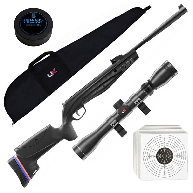 CARACTÉRISTIQUES DÉTAILLÉES : • CALIBRE :4.5 mm (.177) à jupe plomb. • PUISSANCE :7 Joules, idéale pour le tir de jardin et l'initiation. • PROPULSION : Système à ressort et piston par basculement du canon. • CROSSE : Synthétique noire ergonomique avec busc réglable en hauteur. • VISÉE : Hausse réglable et guidon avec inserts en fibre optique (vert/rouge). • SÉCURITÉ : Sûreté automatique s'enclenchant lors de l'armement. • DÉTENTE : Détente à deux étapes pour un lâcher plus net. • MONTAGE : Rail supérieur de 11 mm pour l'installation d'une lunette ou d'un point rouge. • LONGUEUR : Format compact facilitant la manipulation par les jeunes tireurs.
