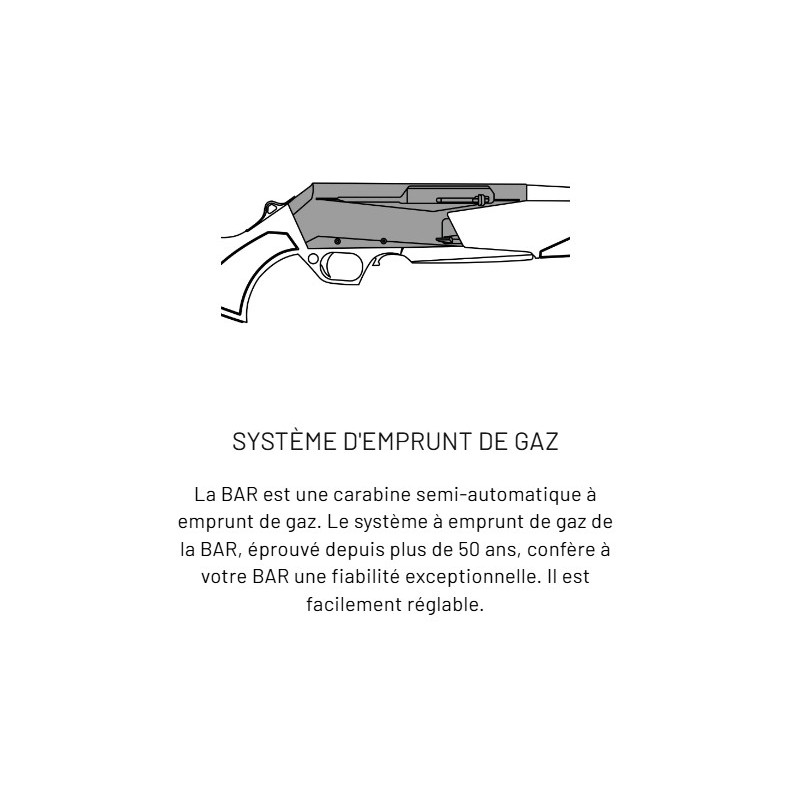 La BAR est une carabine semi-automatique à emprunt de gaz. Le système à emprunt de gaz de la BAR, éprouvé depuis plus de 50 ans, confère à votre BAR une fiabilité exceptionnelle. Il est facilement réglable.
