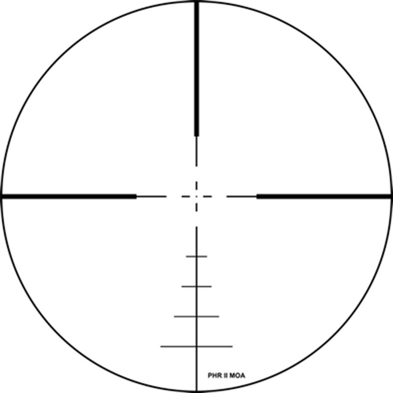 Le PHR II partage toutes les caractéristiques du réticule PHR avec l'ajout d'un point central flottant pour un point de visée ultra-raffiné ainsi qu'un poteau à 6 heures plus fin, permettant des « maintiens » d'élévation encore plus précis.