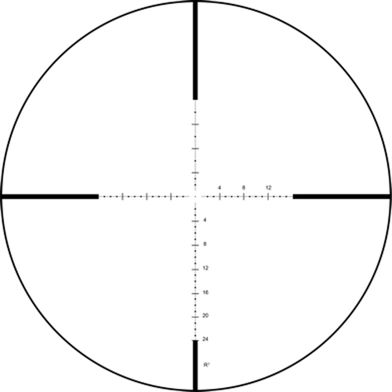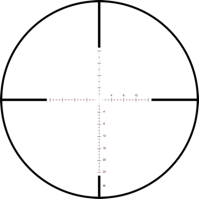 Le R3 est doté d'un point central flottant et de sous-tensions de 1 MOA, indiquées par des points avec un trait tous les 4 MOA. Des barres épaisses à 3, 6, 9 et 12 heures facilitent l'acquisition de la cible.