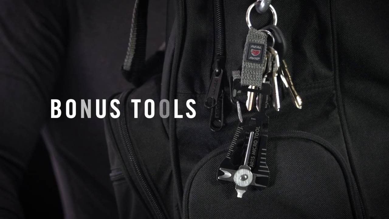 Porte clés outils multifonctions comprenant : grattoir tête de culasse AR15, tournevis, grattoir, décapsuleur, extracteur de goupille, réglette.